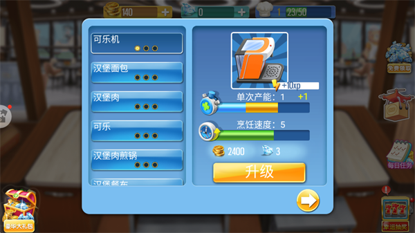 消耗金幣和鉆石來(lái)升級(jí)制作設(shè)備,能夠提高單次產(chǎn)能以及烹飪速度,從而提升美食制作的效率。