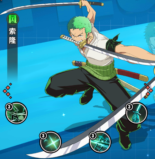 被動技能2:三千世界。索隆施展刀術斬擊,會鎖定敵方生命值最低的目標,對其造成371%的物理傷害;若該目標生命值低于40%,此傷害將額外提升24%。若此次攻擊成功擊殺目標,索隆將恢復自身24%的生命值。
