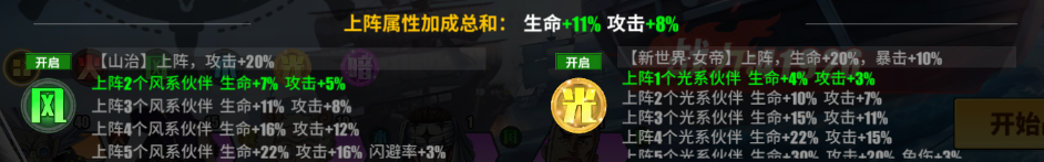 游戲里的不同系別存在相互克制的特性,陣容中同系別的角色會帶來額外的加成效果,五大系別分別是水、風、火、光和暗。