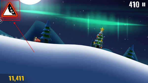 屏幕左上方的雪崩警示牌會在雪堆即將靠近時持續閃爍發出警告,即便你已經能在視野里看到身后洶涌而來的大雪,這時若起身繼續滑行,要擺脫這近在眼前的雪堆也并非毫無可能。