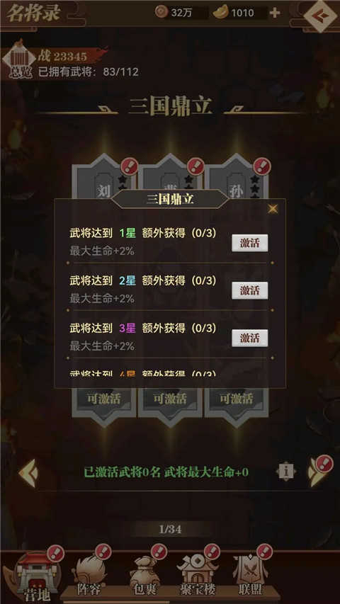 名將錄:獲得新英雄的時候會點亮名將錄獲得整體的戰力屬性提升,其次名將錄中組合武將升星后會獲得某屬性整體提升(喬喬有個小tip:在銅幣豐富的情況下可以升級升星英雄激活想要的屬性后選擇下野返還所有升級經驗,下野后星級會保留哦~)