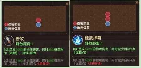 魏國陣營效果:當曹操登場時,1星解鎖狀態下,全體魏國部隊的雙攻提升15%、雙防提升10%、生命值增加15%;7星解鎖后,魏國部隊的雙防進一步提升至15%,生命值增加至20%。此外,曹操作為物攻型英雄,其普攻與大招機制如下: