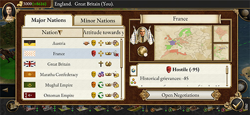 在這款游戲里,玩家能夠挑選不同國家的領導者身份來進行扮演,而每一個國家都具備專屬于自身的長處與特色。游戲當中存在各式各樣的兵種,玩家可以對這些兵種展開招募和訓練工作,像步兵、騎兵、炮兵、海軍之類的兵種都包含在內。除此之外,玩家還能夠去鉆研各類科技,以此來增強國家的整體實力以及軍隊的作戰能力。