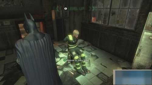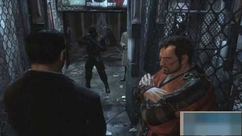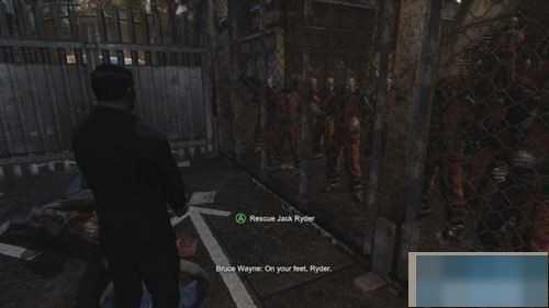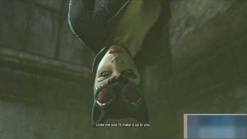 RB鉤住二層后開門進入,透過玻璃看到半臉人將貓女倒掛起來,貌似想要實行家法了。爬梯子到二層后Y鍵偷襲背對自己的守衛后走上吊繩,直接飛下到人群中或者選中守衛下踢都可以,反正需要解決掉下面的少部分守衛,大部分犯人會逃跑。
