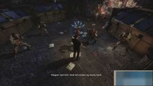 看到藍色衣服的工作人員正在被虐,走過去仍然是反擊干掉一個后X鍵推開犯人,A鍵扶起受傷的工作人員。寡不敵眾再次被俘,這個矮胖的老頭想拿我們出氣,但是沒那么容易,當他頭頂出現閃電標記的時候Y鍵反擊直接打倒。