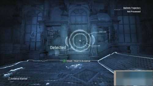 貓女獲救后會從窗外射進一顆子彈,蝙蝠俠判斷是小丑的武器。貓女離開后開始調查子彈的線路,LB進入調查視野后先找到窗戶上的彈孔A鍵調查,然后調查地上的彈孔,通過角度可以定位地點。