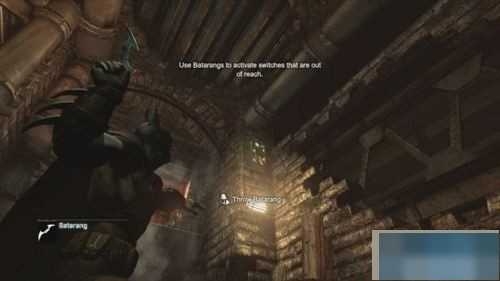 透過鐵網看到Harley正在給囚犯們開大會,從右側地道繞到場地中央,中途需要躲避墻壁的噴火機關。大批囚犯已經撤離,沿著通道來到場地左邊用回旋標按下三個機關,這里的三個機關需要快速按下,所以不用瞄準直接按快速按LT發射。