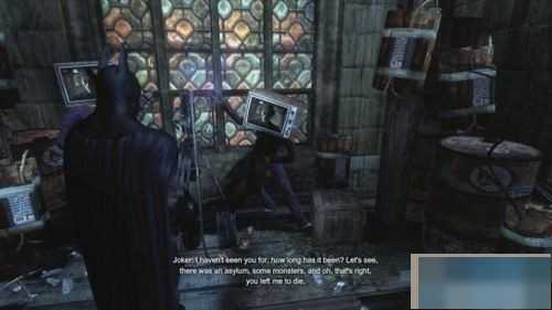 和教堂中可以交談的人對話獲得線索,從正門警察旁邊的木門進入后一直爬到教堂頂部。在小房間內看到了小丑的狙擊槍,進入調查模式后調查狙擊槍,兩個小電視中出現小丑的錄像。這是小丑的陷阱,看到電視中倒計時后連續按A鍵兩次破窗而出。
