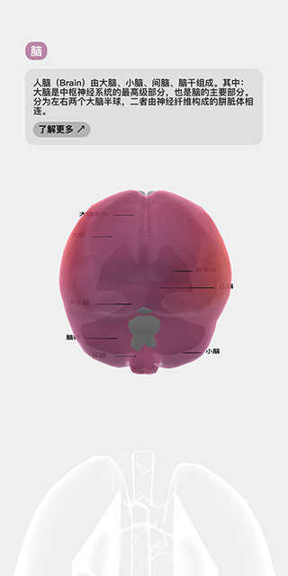 再次點擊該器官,會顯示它的具體說明信息,并在模型中標注出器官構成,點擊下方的了解更多按鈕,同樣會進行瀏覽器跳轉。