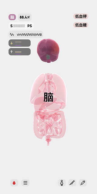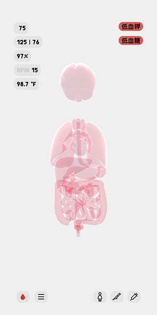 屏幕右上角顯示的是該人體模型的異常狀態,例如現在,她正處于低血鉀和低血糖的狀態中。