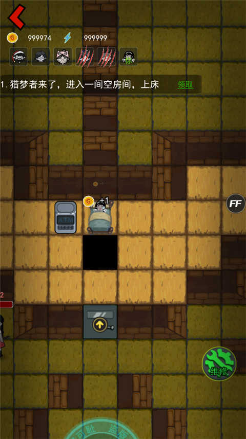 當(dāng)我們的門鎖被猛鬼攻擊了,一定要維修,這樣還可以重新抵擋攻擊。
