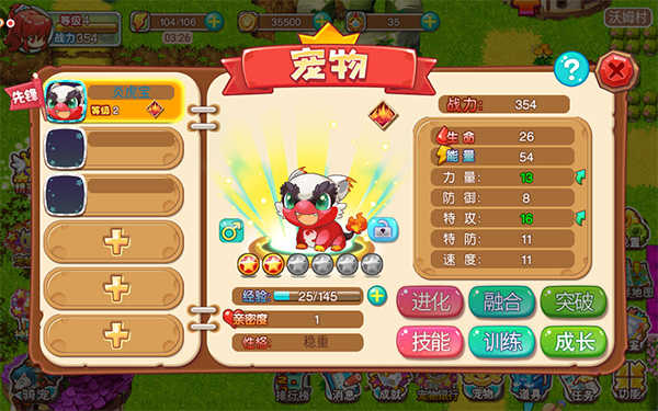 技能狀況上文中已有介紹,當技能升級功能開啟時,在感覺輸出力不從心的時候可以考慮升級技能,由于技能升級所需材料主要靠寵物放生獲得,所以這個材料還是比較好獲得的。在獲得第四個技能后,如果初始寵物還在主力陣容內,優先升級第四技能。