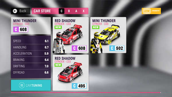 這里有一個名為CAR store的地方,應該是購買車輛的區域。通過比賽贏得金幣后就可以購置新車了。
