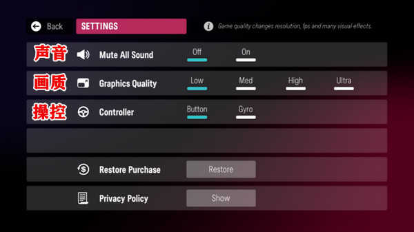 目前尚無中文選項,僅有聲音、畫質、操作等幾個調節項。如果設備性能良好,建議將畫質調至最高。