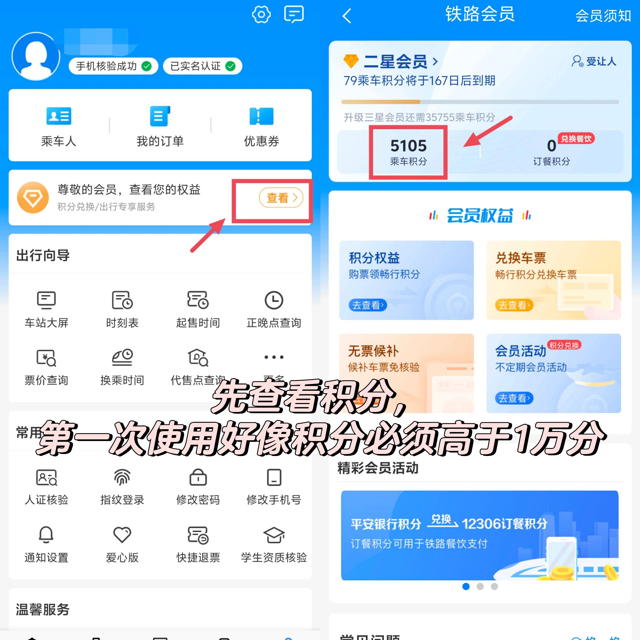 1打開鐵路12306,先查看積分有多少,好像第一次兌換車票需要滿1萬積分哦。