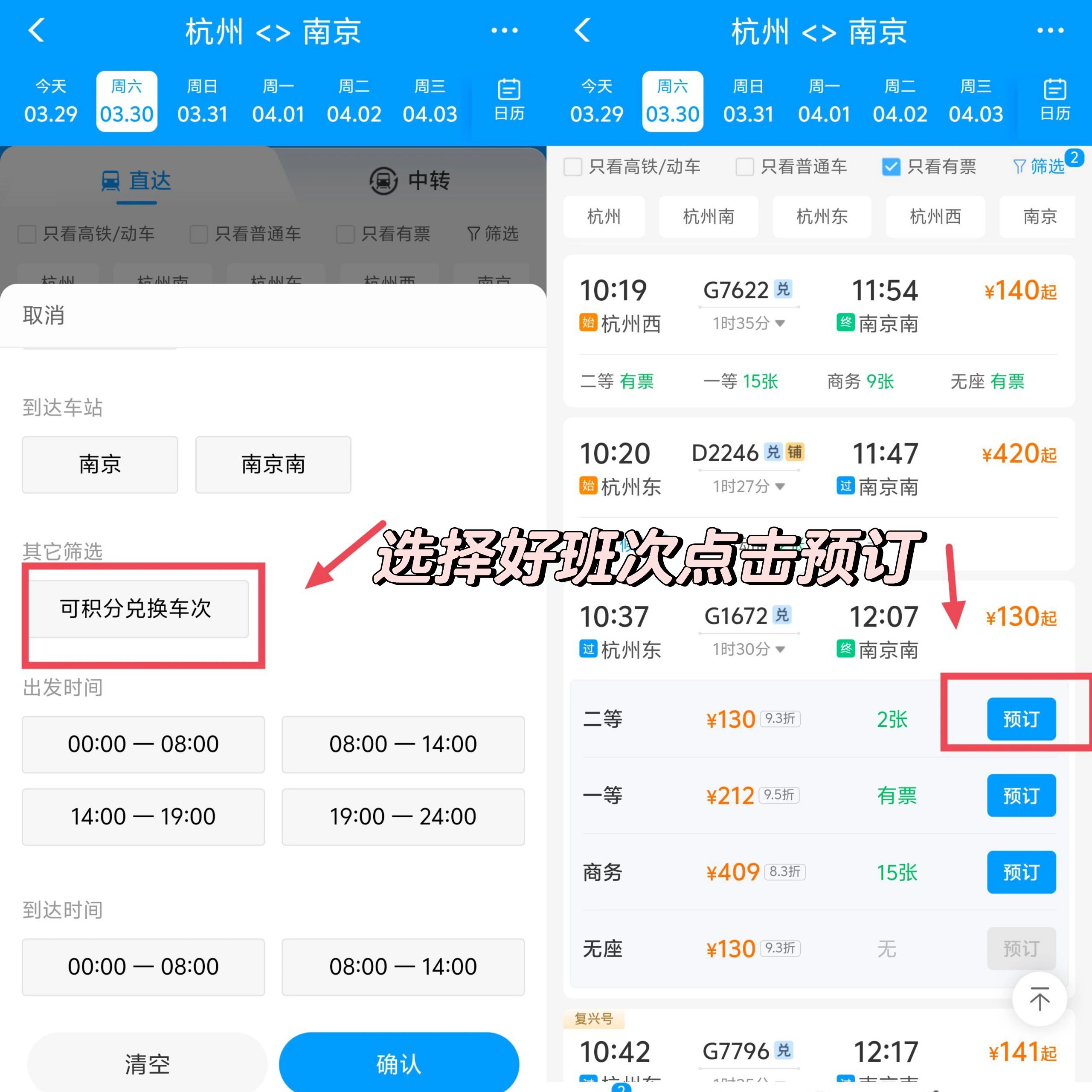 回到主頁面后,先選好日期、城市等信息,接著點擊篩選按鈕,再選擇能夠用積分兌換的車次。