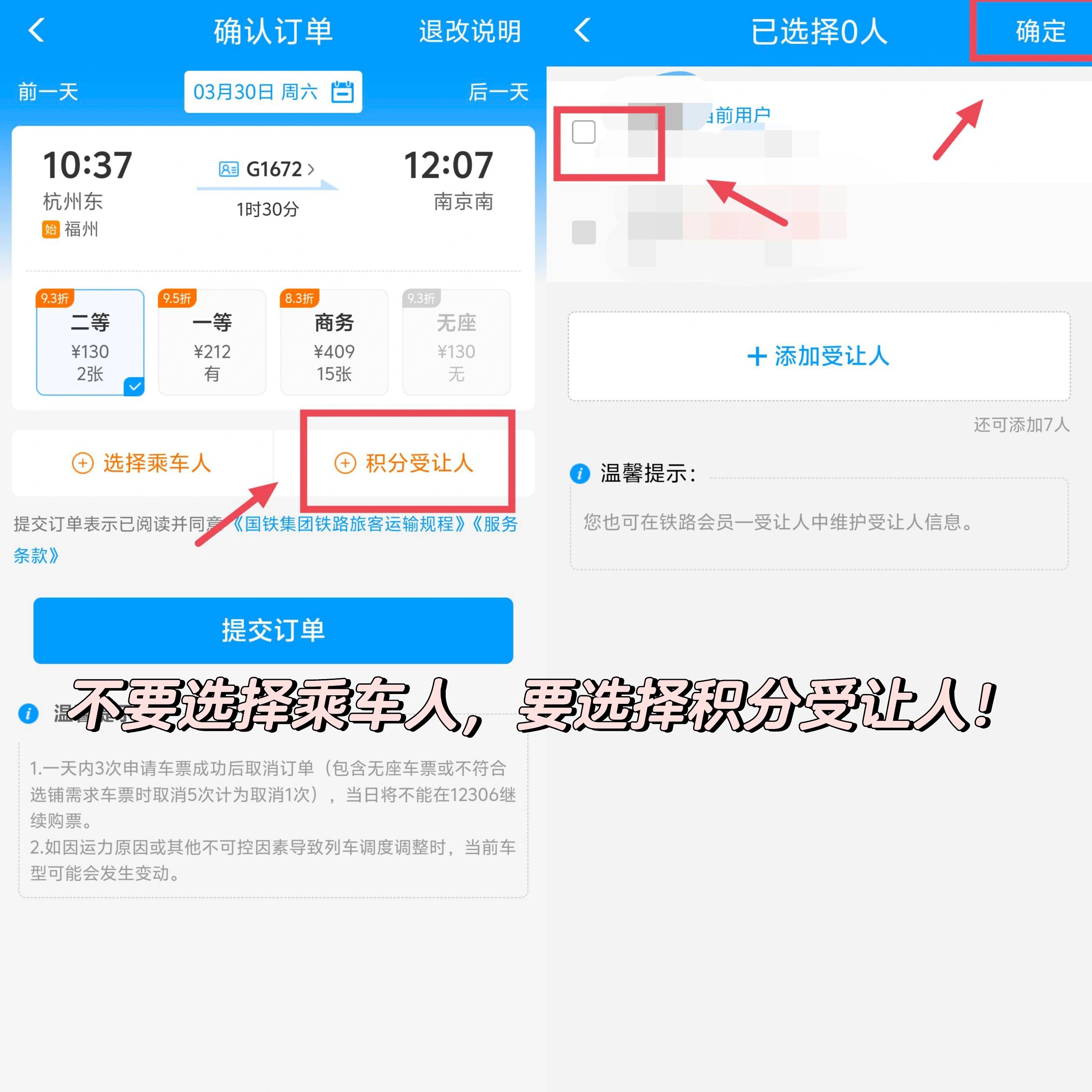 選好車次后,就可以點擊預訂按鈕了!不過注意不要選擇乘車人,而是要選擇積分受讓人哦。