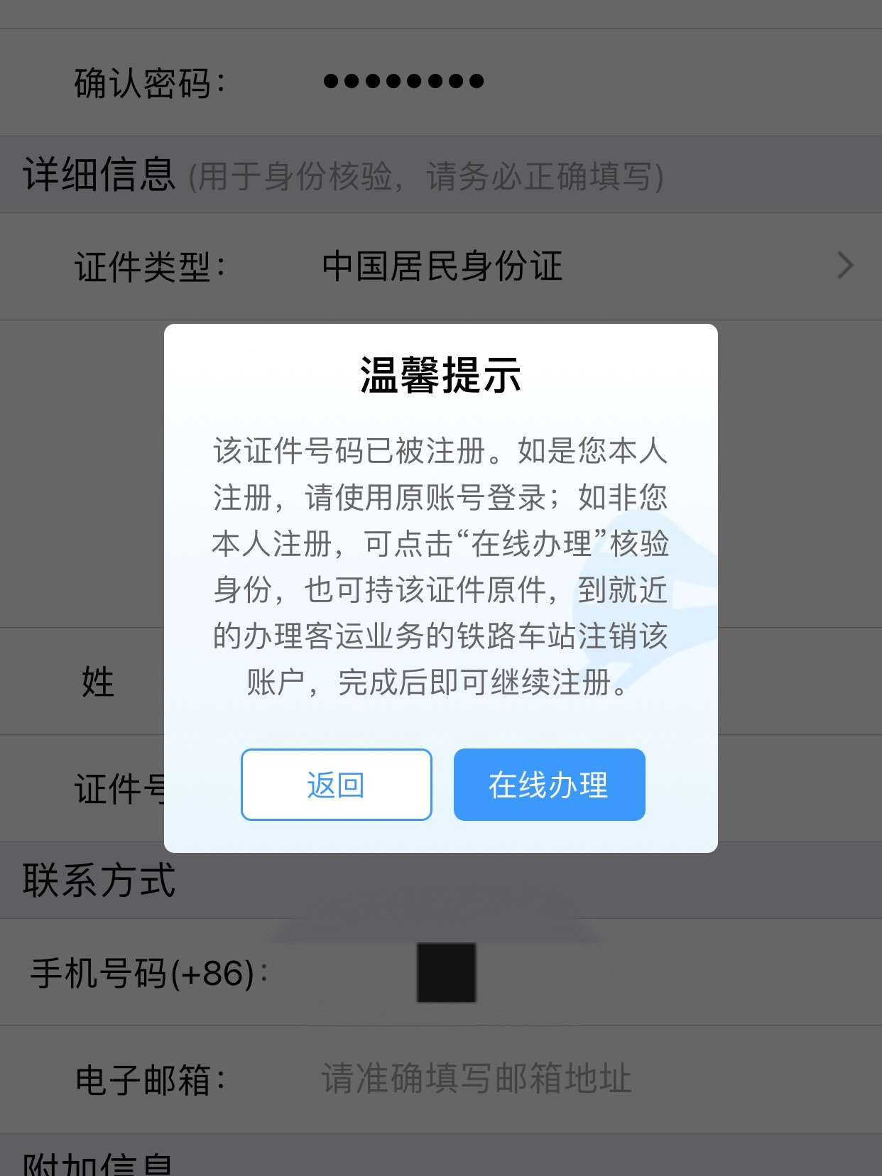彈窗提示改證件號碼已被注冊,點擊“在線辦理”。