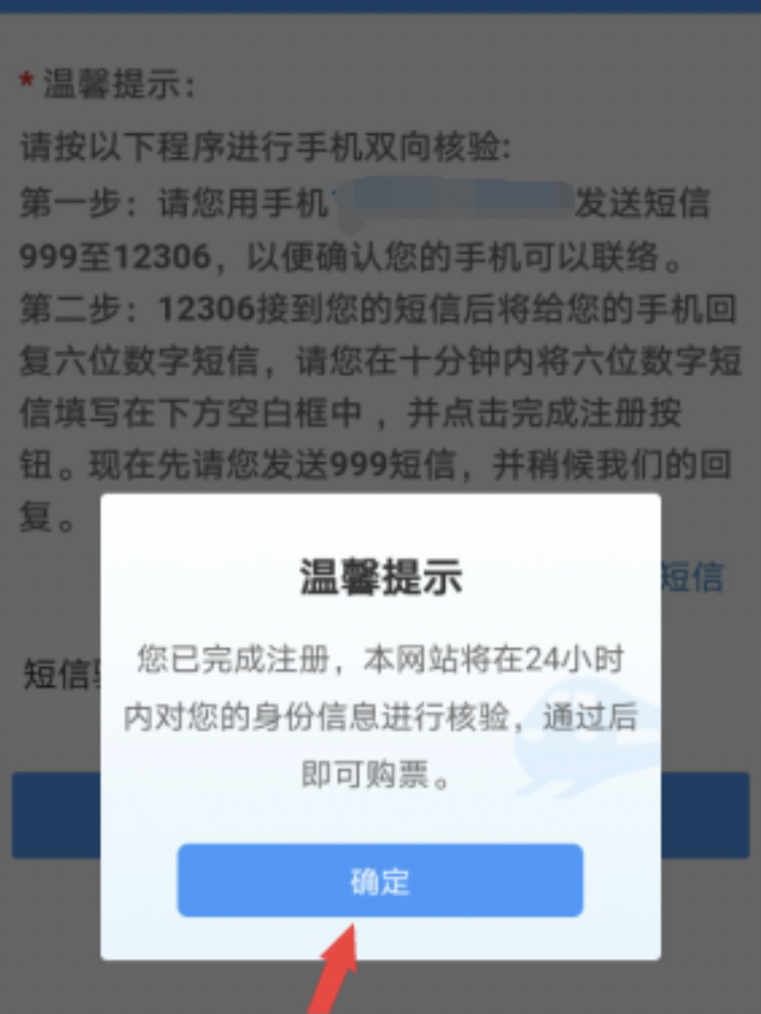 發(fā)送短信“999”至12306,待收到驗證碼后進行輸入,即可完成注冊流程。