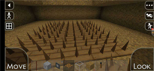 這個陷阱的實用性相對更高,所需材料包括導線、穿線石、按鈕、刺釘、玻璃或柵欄以及木門。首先要挖掘一個大小可自行決定的坑,這里以5×5的尺寸為例進行演示,向下挖掘四格后,在最底層鋪設穿線石。
