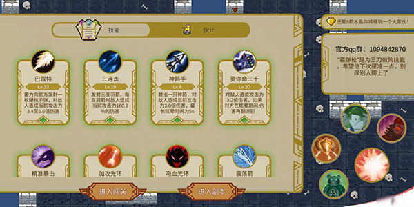 堅韌可以換成激光斬,吸血也能替換,記得選回復(fù)百分比的效果。技能升級優(yōu)先點冷卻縮減,冷卻buff加上羅賓漢能減少40%冷卻時間,再配合技能自帶的減cd效果,所有技能的冷卻都能壓在4秒以內(nèi),血量根本掉不下來,最終數(shù)值能達到千萬穰(單位是億、兆、京、姊、穰)。技能釋放順序是先疊血,再開怒意,接著放aoe;屬性方面優(yōu)先堆血量,不選攻擊,伙伴隨便搭配就行;遇到獎勵房的話,優(yōu)先選10概率重置冷卻的選項。