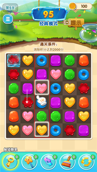 左右滑動糖果能調整本行的排列順序,把相同顏色的糖果拖到一塊兒就能完成消除啦。