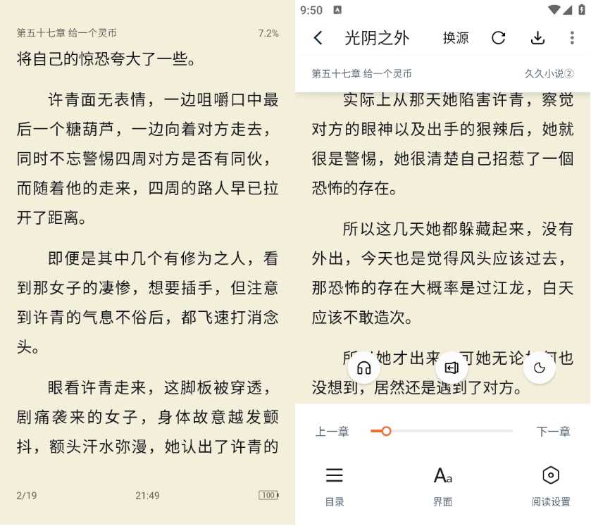最后閱讀界面也值得稱贊,各類個性化設置一應俱全,甚至還具備聽書功能。