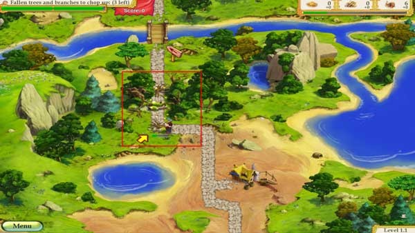 方法:這一關要留意沒有倉庫啦!所有物資最多只能存放20個,可別著急早早去收集資源哦。需要什么再去收集什么。先沿著左上路線走,把漁民小屋升級一次。左上方的兩只動物暫時不用處理,接著走下面的路線,先清理主干道,然后修理左下方的橋梁。過程中如果木材數量達到20了,就趕緊用這些木材修建鋸木廠,要是還有剩余的木材,就建造獵人小屋。之后清理左上和左下方的蜜蜂以及獅子。左上角的金子可以重復獲取,但時間緩沖比較慢。上方的獅子被嚇跑以后,會有木材可以拿。要是木材充足的話,可以再次升級漁民小屋。之后就以開鑿石頭為主,收集材料為輔,很快就能通關了。