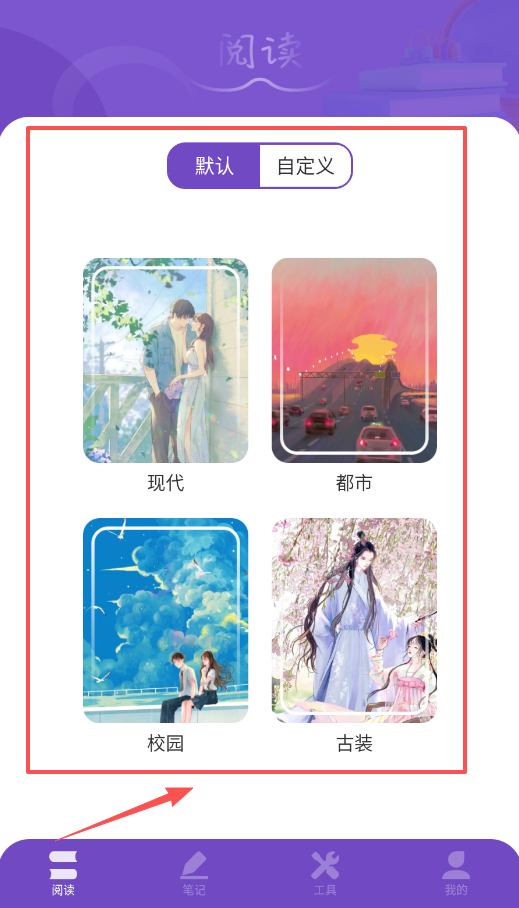 一、在主界面底部的導(dǎo)航欄中選擇閱讀功能,你會(huì)看到默認(rèn)模式與自定義模式這兩種選項(xiàng),能夠輕松開(kāi)啟你的閱讀之旅。