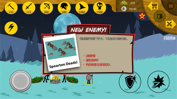 前期要盡量快速解決戰斗,把礦工數量控制在五個以內,不然金礦挖完后礦工就會白白送死,同時要盡可能多積累資源,之后重點訓練矛士和弓箭手,在敵人發起進攻前奪取雕像。