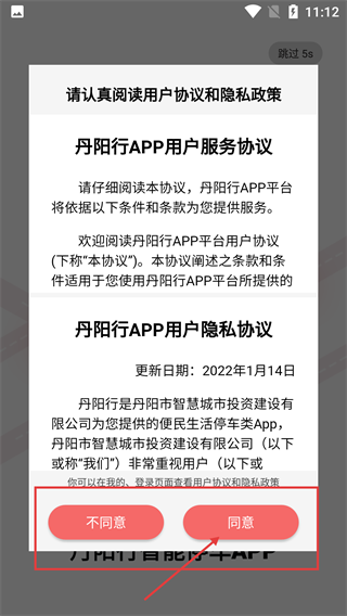 首次使用丹陽行時,需點擊【同意】按鈕,在同意用戶協議與隱私政策后即可進入界面。