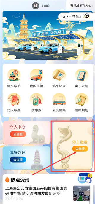 在小程序界面中,點擊【停車繳費-去繳費】的選項,即可進入停車繳費的頁面。