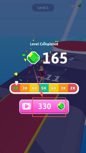 抵達終點后,倍數條會從「2X」直接跳至「5X」,當總分達到「165」時,屏幕就會顯示「Level Completed」。