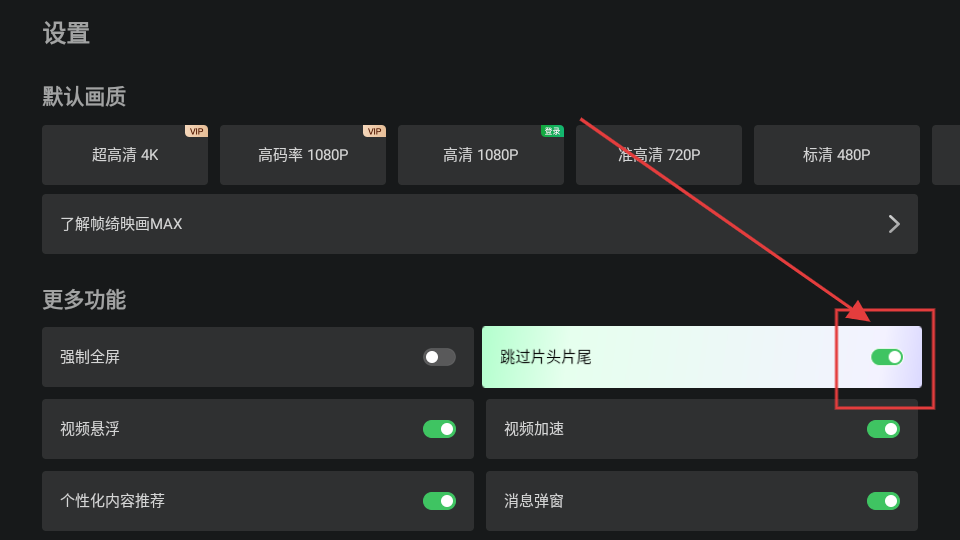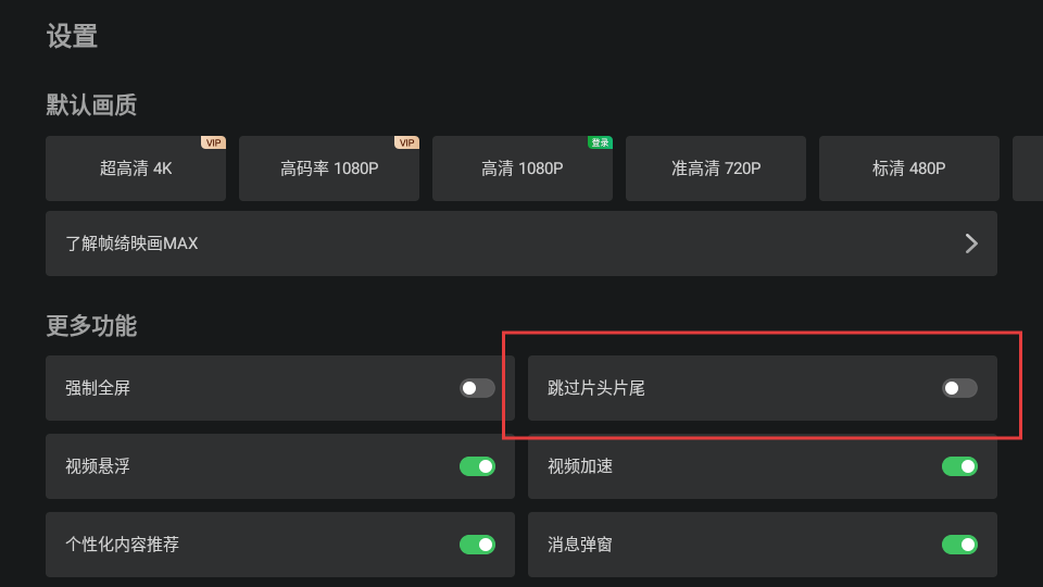 在設置界面的“更多功能”板塊里,能找到【跳過片頭片尾】這個選項,目前它處于關閉狀態。