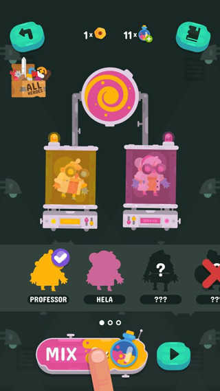 當闖完關后進入選擇關卡的時候點擊屏幕右上角的角色鍵,進入后你可以看到黃粉兩個機器,只需要把屏幕下方的允許合成的兩個人物拖動到上方的機器中點擊MIX鍵就可以合成出新的人物了。