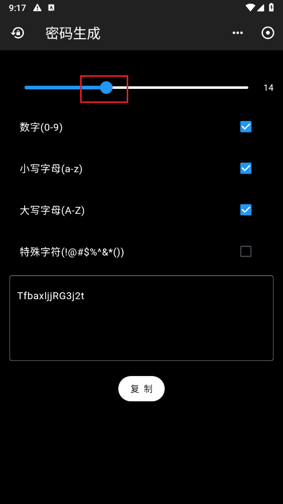 點擊“密碼生成”按鈕進入后,拖動橫線就能調節密碼的強度等級。