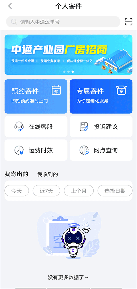 中通快遞是中通推出的綜合快遞服務平臺,集成了寄快遞、取快遞、查單號等功能,涵蓋多個服務板塊。用戶在各大購物平臺的快遞信息會自動同步至該平臺,還能在線預約上門取件,一鍵下單便捷高效,足不出戶即可快速完成寄件操作。