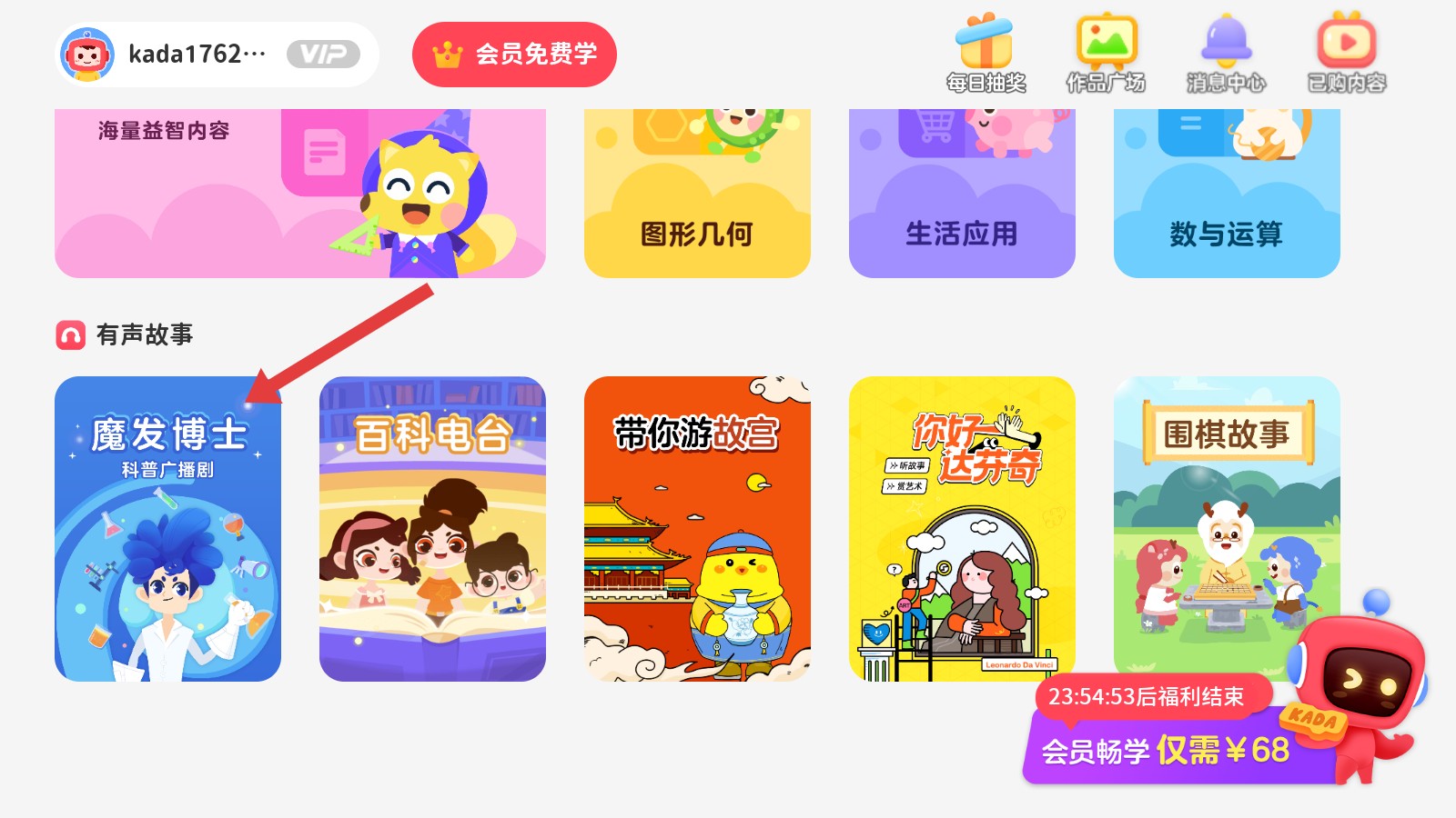 我們可以在首頁找到【有聲故事】板塊,點擊其中的【魔發博士-科普廣播劇】,就能進入精彩的科普音頻內容世界啦。