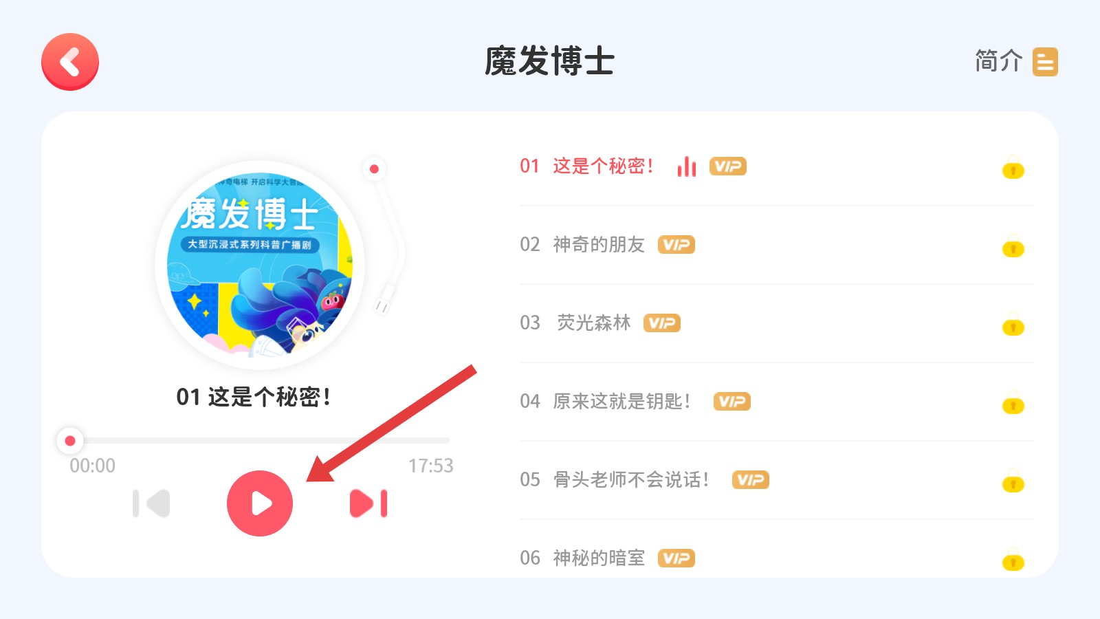 進入【魔發博士】的播放頁面后,點擊那個紅色的播放按鈕,就能收聽《這是個秘密》這類趣味科普內容了,而且還可以自由切換章節哦。