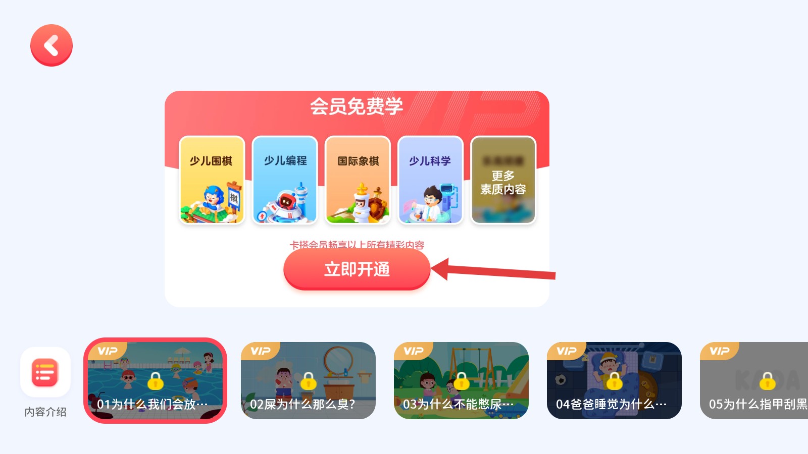 若想解鎖更多VIP專屬內容,不妨點擊【立即開通】按鈕,這樣就能暢享少兒圍棋等豐富的會員專屬資源,盡情收獲滿滿的學習樂趣了。