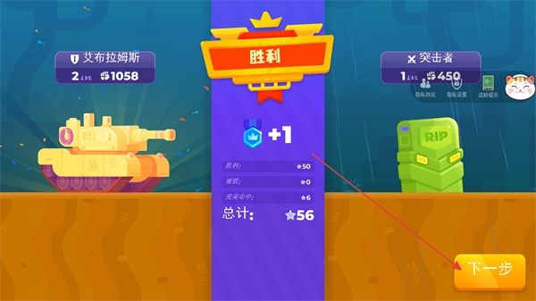 摧毀敵方坦克后,即可獲取勝利獎(jiǎng)勵(lì),點(diǎn)擊下一步便能繼續(xù)挑戰(zhàn)后續(xù)關(guān)卡。