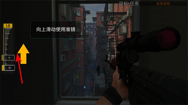 向上滑動屏幕即可啟用準鏡,啟用后視野會被放大,能更清晰地觀察遠處目標,從而助力精準打擊。