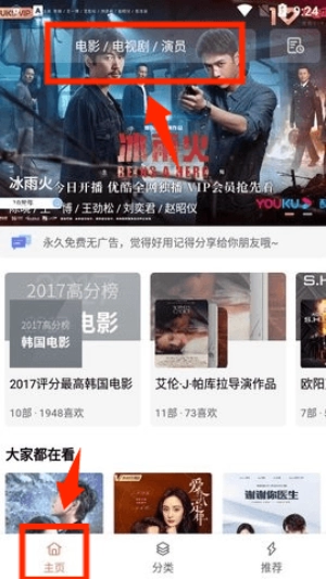 打開(kāi)應(yīng)用主頁(yè)后,可借助頂部的搜索欄來(lái)搜索影片或者演員的相關(guān)信息。