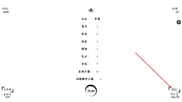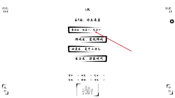 在這個界面里,你需要選擇對應的分區選項“舞蹈區體質-1藝術+1”,選好之后系統就會相應地調整角色的屬性數值,這樣就能繼續推進投胎的流程了。