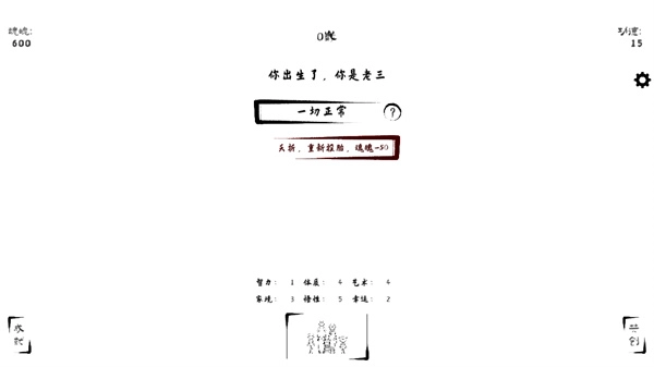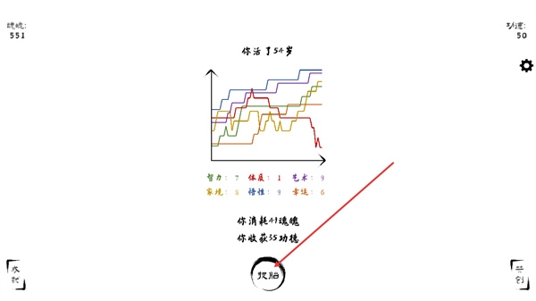 查看本次人生的屬性變化圖表與存活年齡,點擊投胎按鈕消耗魂魄開啟新人生,積累功德以提升后續屬性。