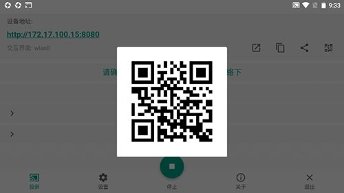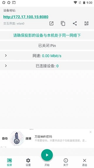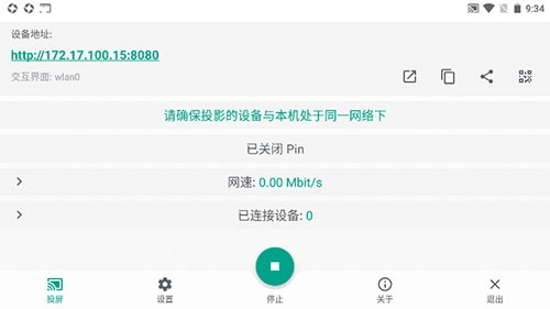 請(qǐng)使用已安裝“易互動(dòng)”的手機(jī)進(jìn)入軟件界面,在首頁(yè)找到并點(diǎn)擊“投屏”板塊,待確認(rèn)成功獲取“設(shè)備地址”后,點(diǎn)擊開(kāi)始按鈕。