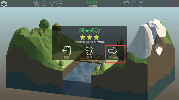 在確認闖關成功后,點擊下一關按鈕繼續挑戰,通過積累經驗可以提升后續關卡的建造效率。