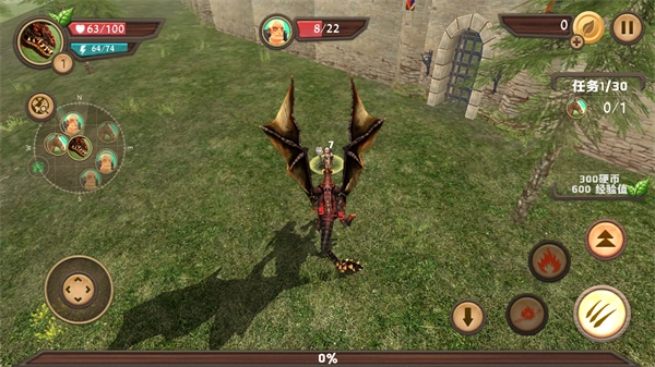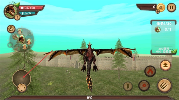 進入游戲主場景后,通過左側的移動按鈕來操控龍的移動,完成右側任務進度1/30對應的目標,以此來獲取硬幣與經驗值。