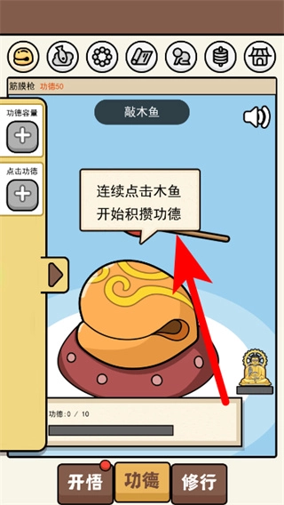 在散修功德界面,連續點擊木魚區域,就能開始積累功德數值。
