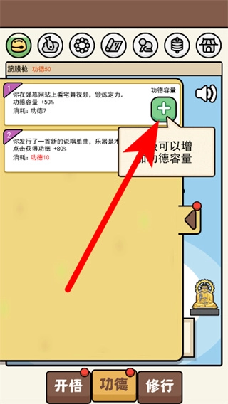 在功德界面的左側區域,找到功能容量旁邊的加號按鈕并點擊,就能提升功德的存儲上限。